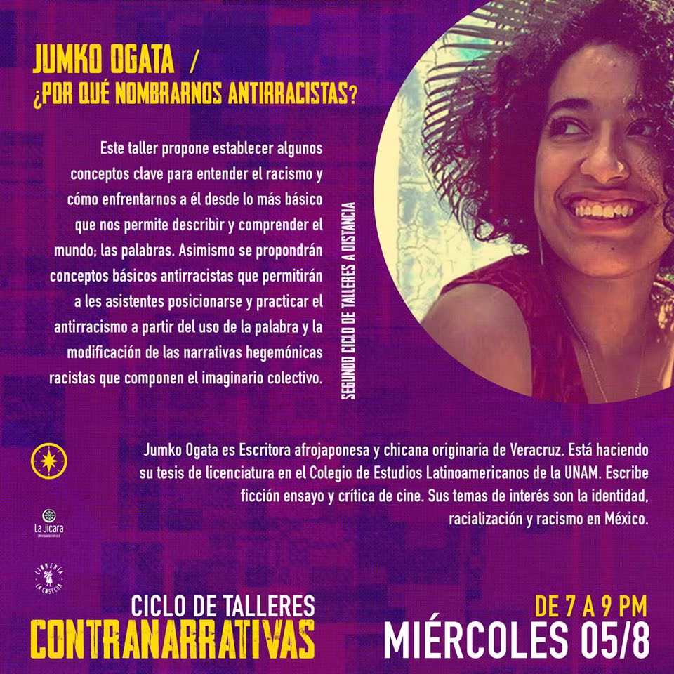 Este taller propone establecer algunos conceptos clave para entender el racismo y cómo enfrentarnos a él desde lo más básico que nos permite describir y comprender el mundo; las palabras. Asimismo se propondrán conceptos básicos antirracistas que permitirán a les asistentes posicionarse y practicar el antirracismo a partir del uso de la palabra y la modificación de las narrativas hegemónicas racistas que componen el imaginario colectivo.