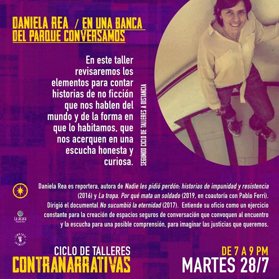En este taller revisaremos los elementos para contar historias de no ficción que nos hablen del mundo y de la forma en que lo habitamos, que nos acerquen en una escucha honesta y curiosa.